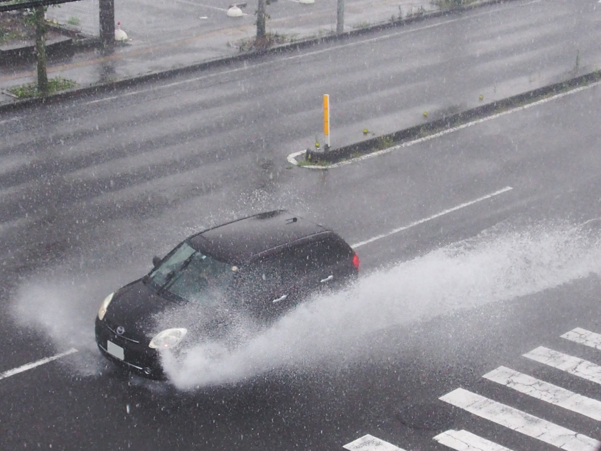路面が滑りやすくなることも豪雨だけでなく通常の降雨の際でも発生します。タイヤの溝が浅い場合には、水はけが悪くなり、走行中にハンドル操作が不能になるハイドロプレーニング現象が起こりやすくなり、大変危険です。タイヤの残り溝の定期的なチェックを行い、降雨の際のグリップ性能を維持することに努めましょう。