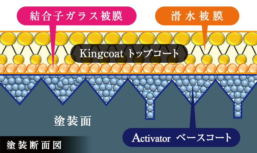 ベ一スコート(Activator)とトップコート(Kingcoat)の2回塗りを行う<グラスープレックス™テクノロジー >により、圧倒的な超滑水性と吸い込まれるような深い艶を実現しました。2層のガラス 被膜層と滑水被膜層の3層構造で更にシロキサン結合を最小分子化させることで、他にはない滑水性能を可能にし、気持ちが良いほど水滴がボデイ ーから滑り落ちます。洗車キズにも強いため、日頃のお手入れが楽になり、大事なお車を日常のキズや通常考えられる汚染物質から守ります。